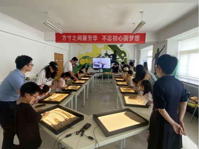 活动正式开始后,家长和孩子们开始在老师的细心指导下进行沙画的绘制,经过撒沙、调匀、抹平、勾勒等一系列操作后,纷纷完成了漂亮且富有创意的作品。活动现场洋溢着温情、欢乐的气氛。