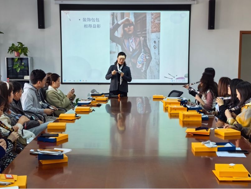 3月8日中午,女教职工们齐聚广宇楼4楼会议室。学院孙倩教授应邀为全体女教职工带来了“她·之名”时尚礼仪讲座,详细讲解了日常礼仪与装饰技巧,并展示了各种丝巾的系法。活动现场气氛热烈,欢声笑语不断,大家在繁忙的工作之余,释放了压力,陶冶了情操。