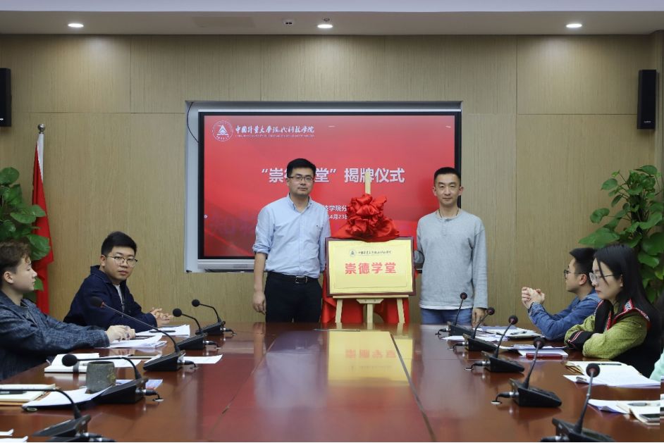最后,学院分工会主席徐鎏和副主席胡志洪共同为“崇德学堂”揭牌。
