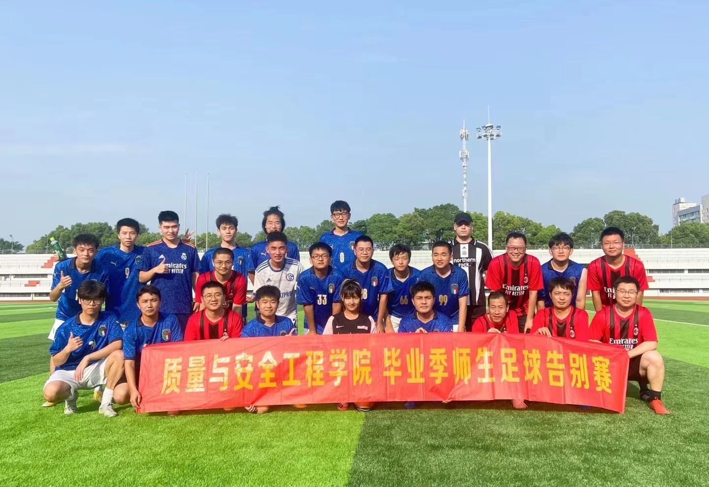 为欢送质量与安全工程学院2022届毕业生,表达学院教工对毕业生们的美好祝福,由学院分工会和学工办共同组织,于6月8日下午四点,在计量东区体育场举办了一场暖心的毕业季师生足球告别赛。