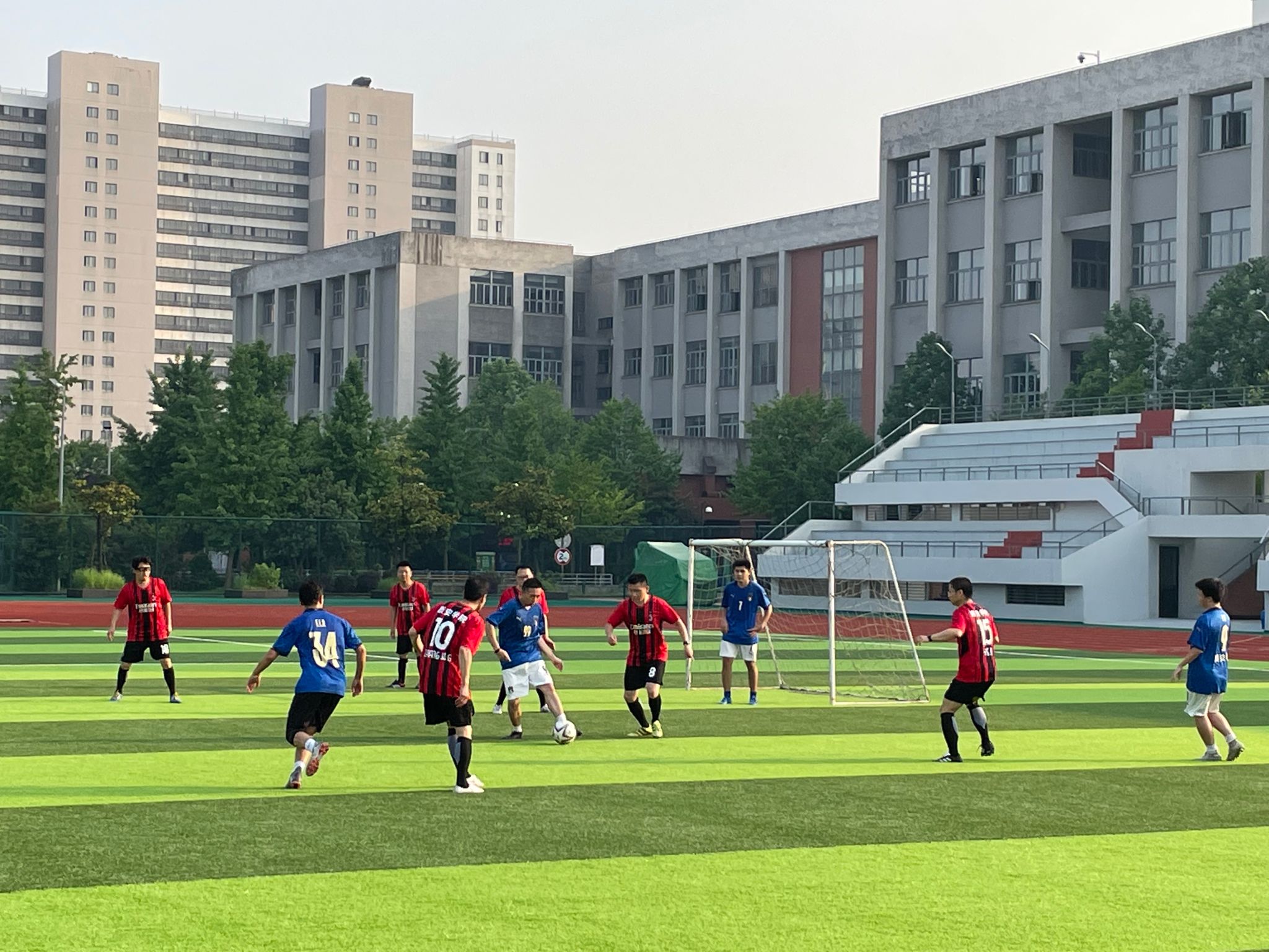 比赛共分为三支队伍,教工队、毕业生队和在校生队,三队之间进行循环角逐。随着一声哨响,比赛在轻松、愉悦的气氛下正式开始;过程中学生队生龙活虎、闪转腾挪、能跑能突,教工队经验老成、技术过硬、攻防稳健,比赛从始至终精彩纷呈,球场上不时传来欢声笑语和高声喝彩,映照着四年来师生们在绿茵场上共同留下的美好回忆。