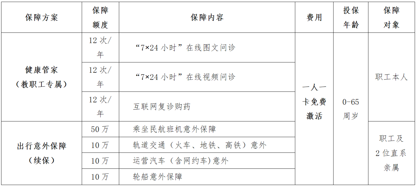 为深入实施“教师关爱”工程,落实医疗保障服务,积极探索商业保险在职工保障体系中的应用,增强教职工抵御风险的能力与水平。经联系,泰康养老保险股份有限公司将于近日来校继续为教职工提供出行无忧意外保障卡发放服务。现将有关事项通知如下: