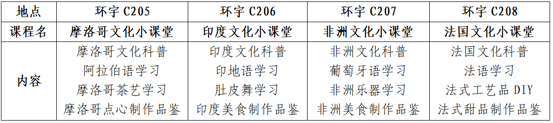 来自法国、印度、斯里兰卡、摩洛哥、津巴布韦、莫桑比克的优秀国际学生将为教工子女精心准备4个不同主题的文化小课堂,每个课堂时长40分钟左右,以互动环节为主。每位教工可在报名过程中为子女任选3个主题的课程,组织方将根据报名情况为每位教工子女安排课程。4个主题课堂内容如下: