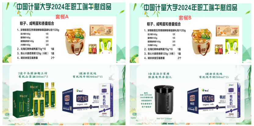 2024年端午节慰问品共含粽子、咸鸭蛋、香囊及自选套餐(A/B套餐二选一),前期已通知广大教职工自行选择,未选择默认发放套餐A。