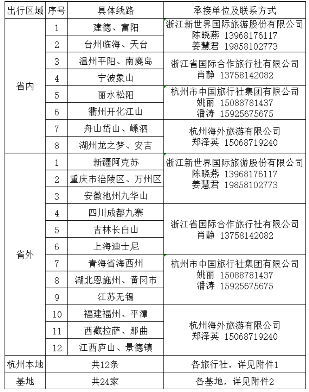 根据教职工疗养地意向征集汇总,经学校招标采购后,确定杭州本地12条线路、省内8条线路、省外12条线路,分别由四家中标旅行社承接(详见附件1)。同时,省内疗养也可赴上级工会提供的24个疗休养基地和服务单位(详见附件2)。