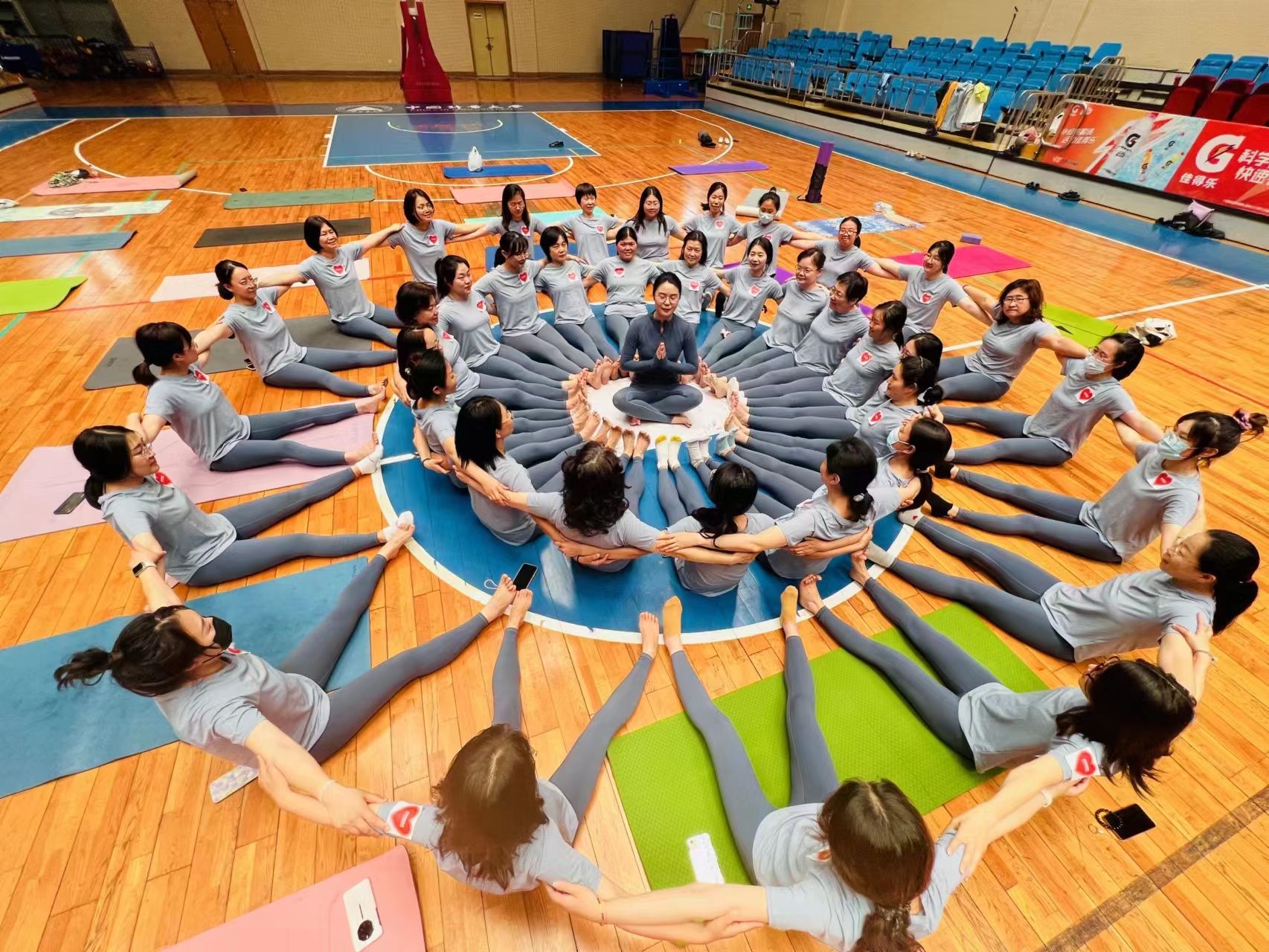 在专业瑜伽教练的带领下,50余名教职工的身体关节伴随着呼吸逐渐打开,在身体的前屈、后展、扭转中感受身体的放松和精神的愉悦。教工们统一着装,在身体流动中,完成与自我身心的对话。