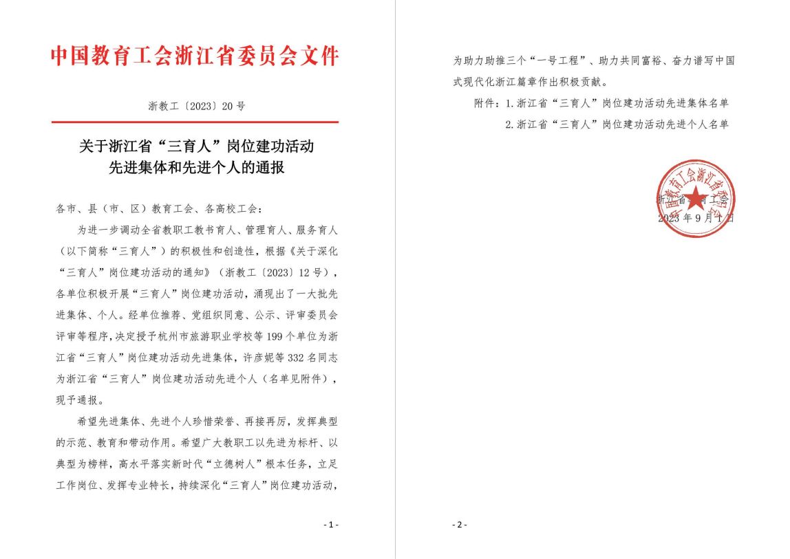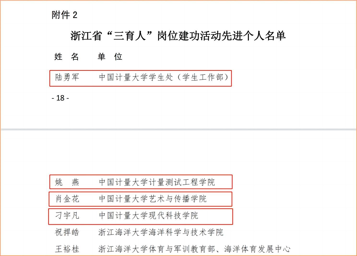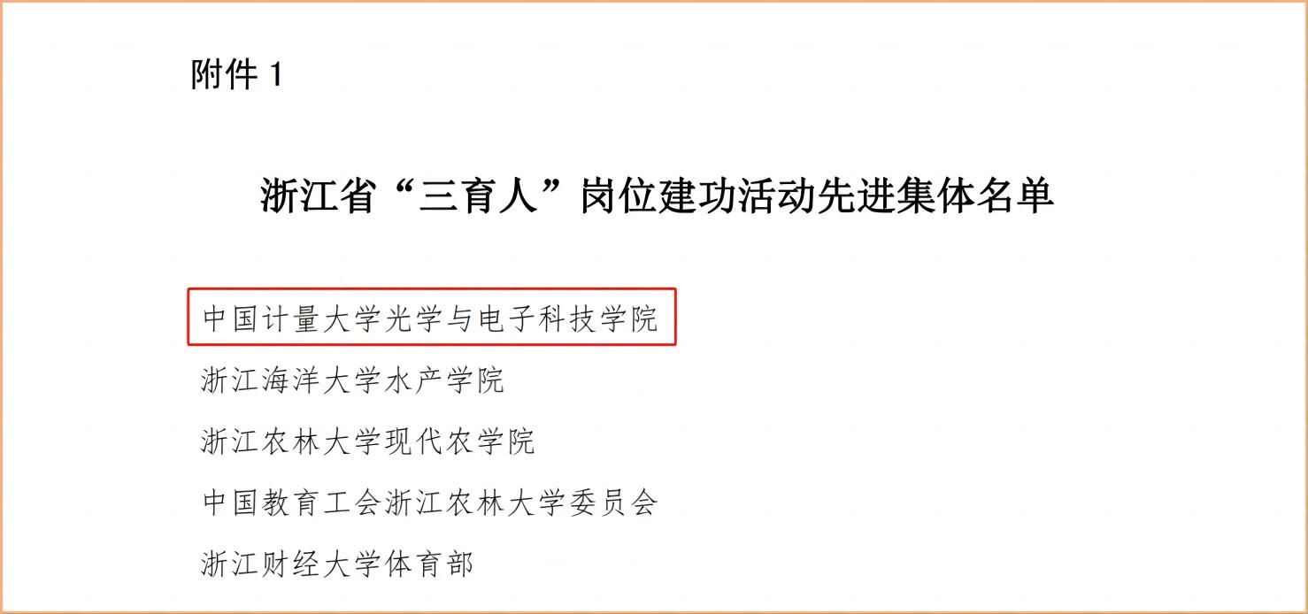 近日,浙江省教育工会发布《关于浙江省“三育人”岗位建功活动先进集体和先进个人的通报》,我校光学与电子科技学院被授予浙江省“三育人”岗位建功活动先进集体荣誉称号,学生处(学生工作部)陆勇军、计量测试工程学院姚燕、艺术与传播学院肖金花、现代科技学院刁宇凡等四名教师被授予浙江省“三育人”岗位建功活动先进个人荣誉称号。