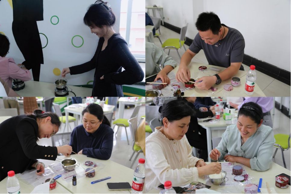 随后就是最受欢迎的手工制作驱蚊香薰蜡烛的体验环节,在老师的指导下,教职工们开始动手制作,选择了自己喜欢的香薰精油和干花,按照步骤进行操作体验。