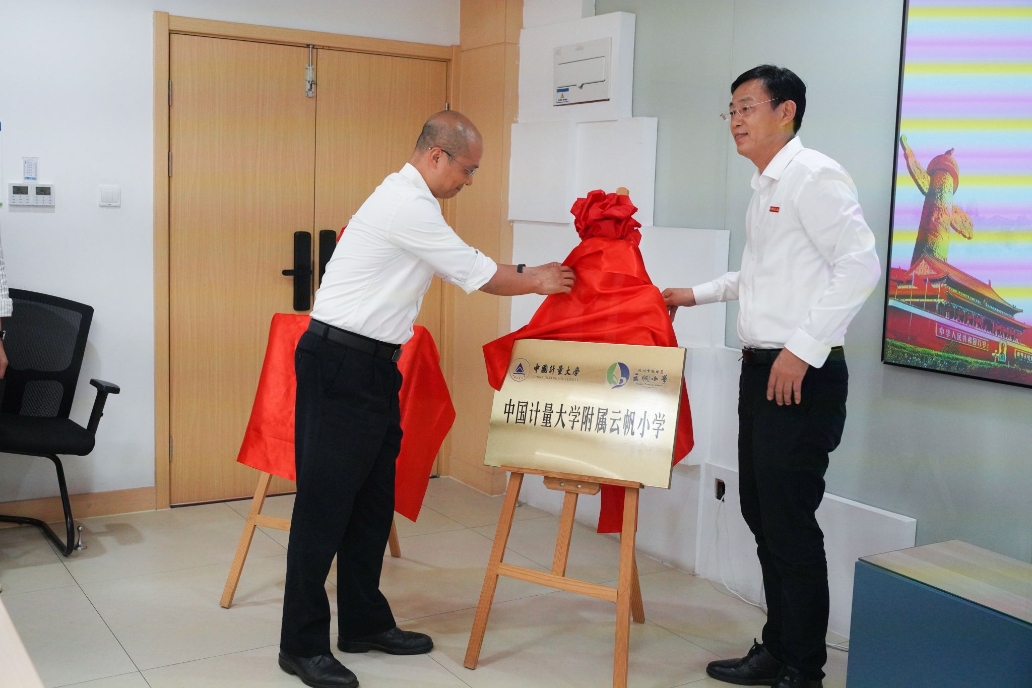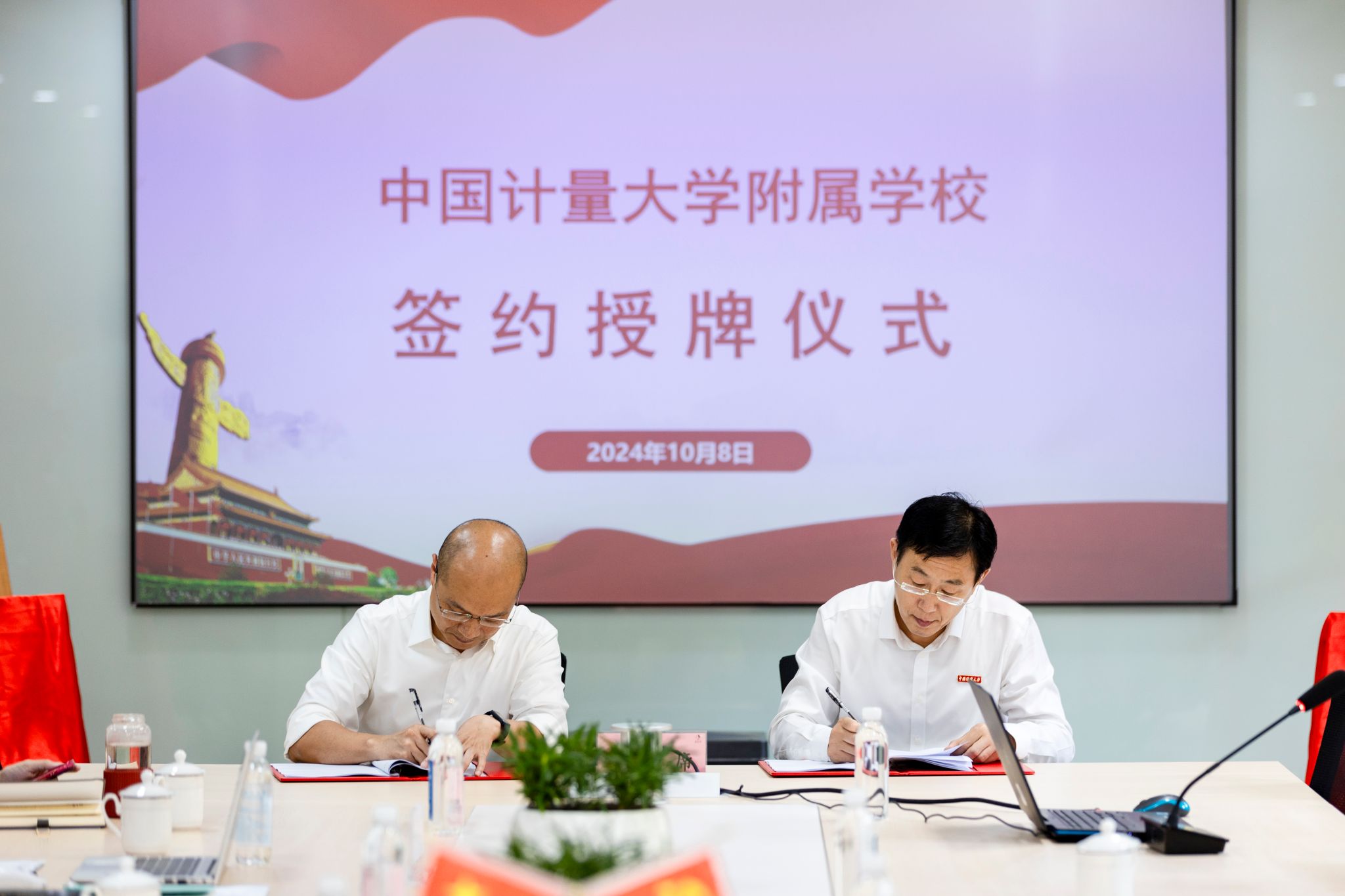 副校长王新庆,钱塘区教育局党委书记、局长吴波,分别代表学校与钱塘区签署合作共建中国计量大学附属学校战略框架协议,并为附属学校揭牌。