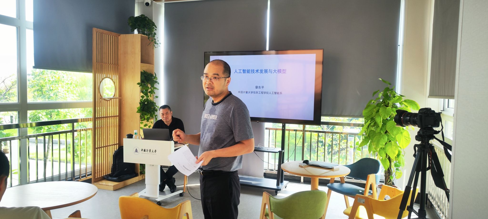 章东平教授现为我校信息工程学院教授、博士研究生导师、省级领军人才,湖州市“南太湖精英计划”领军型创业团队负责人,浙江省科技厅物联网(数字安防)重大项目专家组组长、人工智能重大项目专家组专家及杭州市人工智能重大项目专家组专家,智能感知省级创新联合体(杭州海康威视数字技术有限公司牵头)中国计量大学校方技术负责人。作为第一发明人申请发明专利70余件,获发明专利授权50余件,近5年发表学术论文28篇(SCI/EI收录26篇),相关成果“高速大规模视觉计算引擎关键技术及应用”获2023年浙江省科技进步二等奖。在本次分享会上,章教授介绍了人工智能的概述及其发展历史,重点讲解了当前主要的AI技术分支,包括机器学习、深度学习和自然语言处理。最后章教授介绍了课题组在人工智能与大模型技术方面的成功应用案例及相关进展,展示了团队在该领域的创新成果。在本次分享会上,章教授不仅分享了宝贵的学术智慧,还在会后和老师们进行了进一步的交流,为老师们带来了更多富有价值的创新思维,现场氛围热烈。