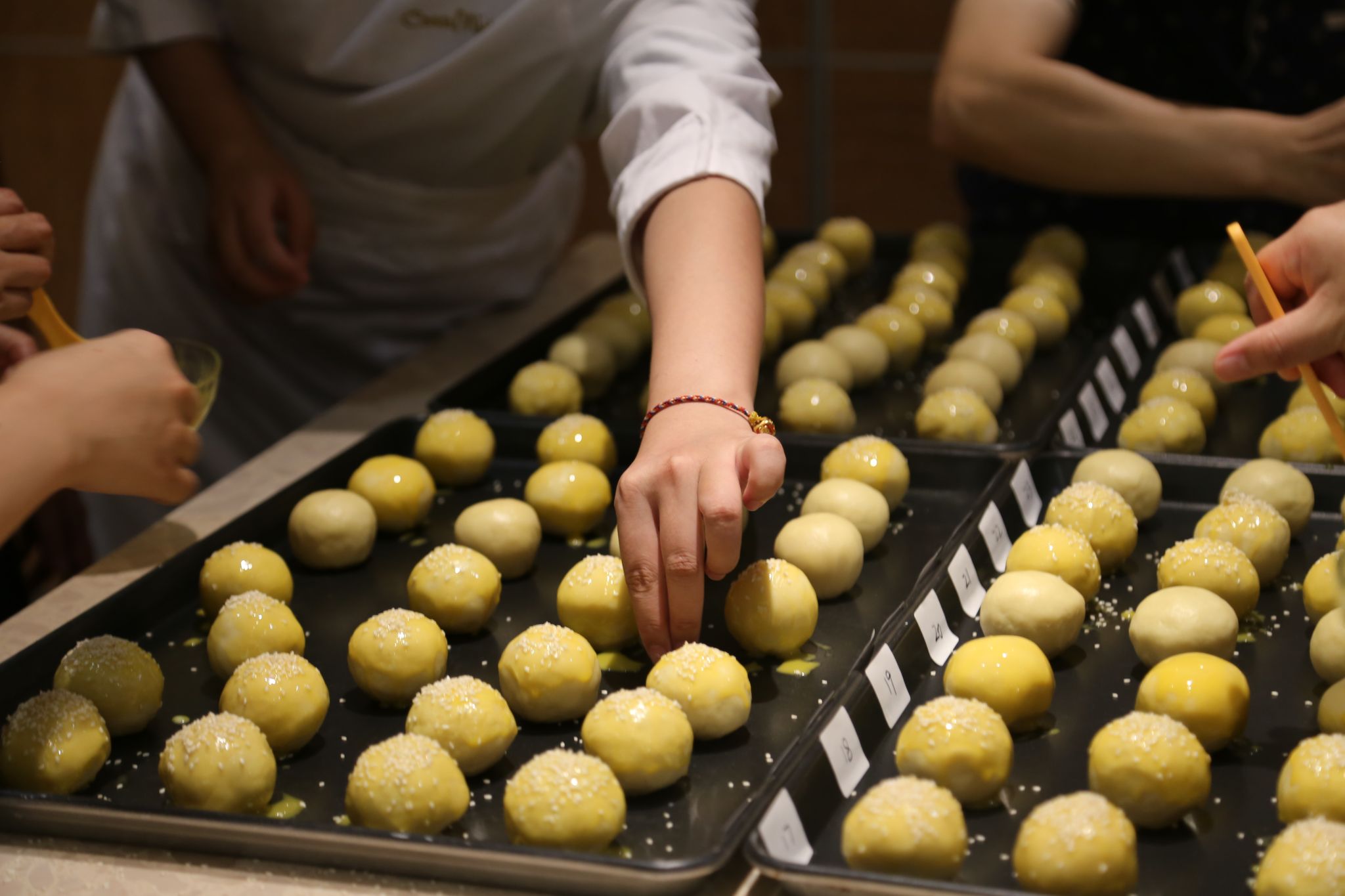 活动现场香气四溢,初次尝试糕点制作的教职工们热情高涨,围站在操作台前认真聆听讲解。专业糕点师手把手指导大家包入咸蛋黄、捏紧酥皮,再刷上蛋液、撒上芝麻。教职工们很快掌握了技巧,寻常食材在指尖渐渐成型。烘烤后,一份份金黄诱人、酥香可口的蛋黄酥陆续出炉。