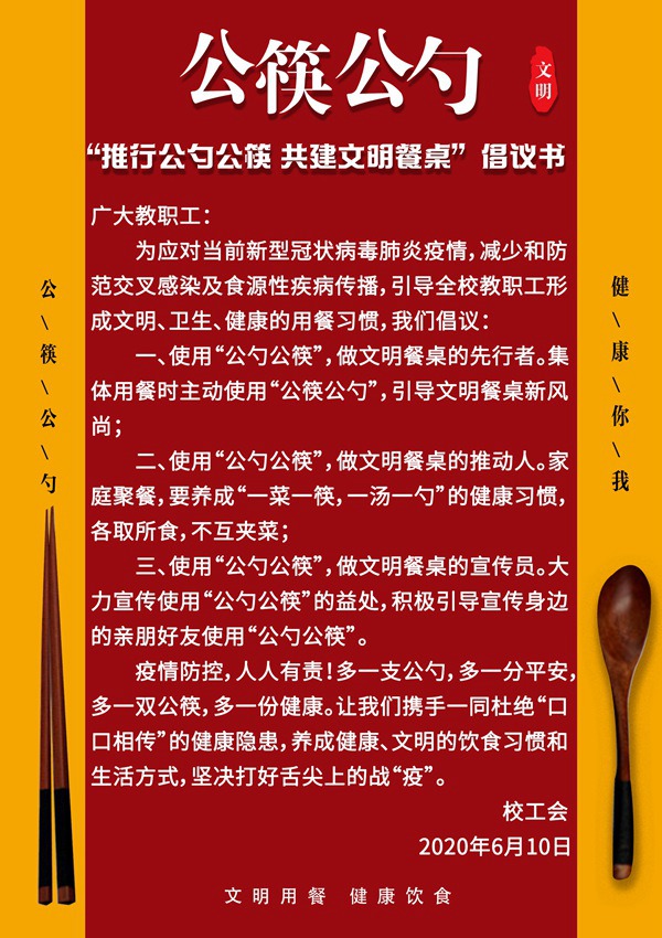 民以食为天、食以安为先。此次活动希望号召广大教职工成为推行“公勺公筷”的支持者和推广者,一起摒弃不良用餐习惯,通过养成健康、文明的饮食习惯和生活方式,杜绝“口口相传”的健康隐患,共同打好舌尖上的 防“疫”战。
