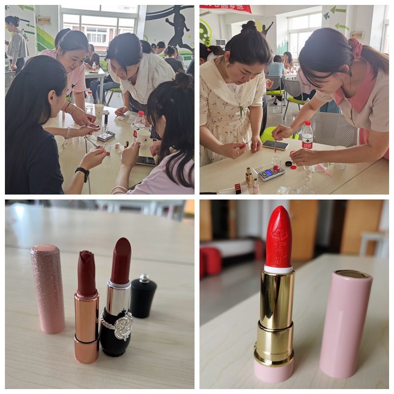 老师们两两分组,饶有兴致地参与到体验活动中。在王老师的指导下,大家有条不紊地消毒器具、研磨色粉、搅拌蜂蜡、滴入精油,然后倒模、冷凝,经过近一个小时的精心创作,大家小心翼翼地倒模后看到自己制作的专属口红顺利成型,收获了满满的成就感和幸福感。