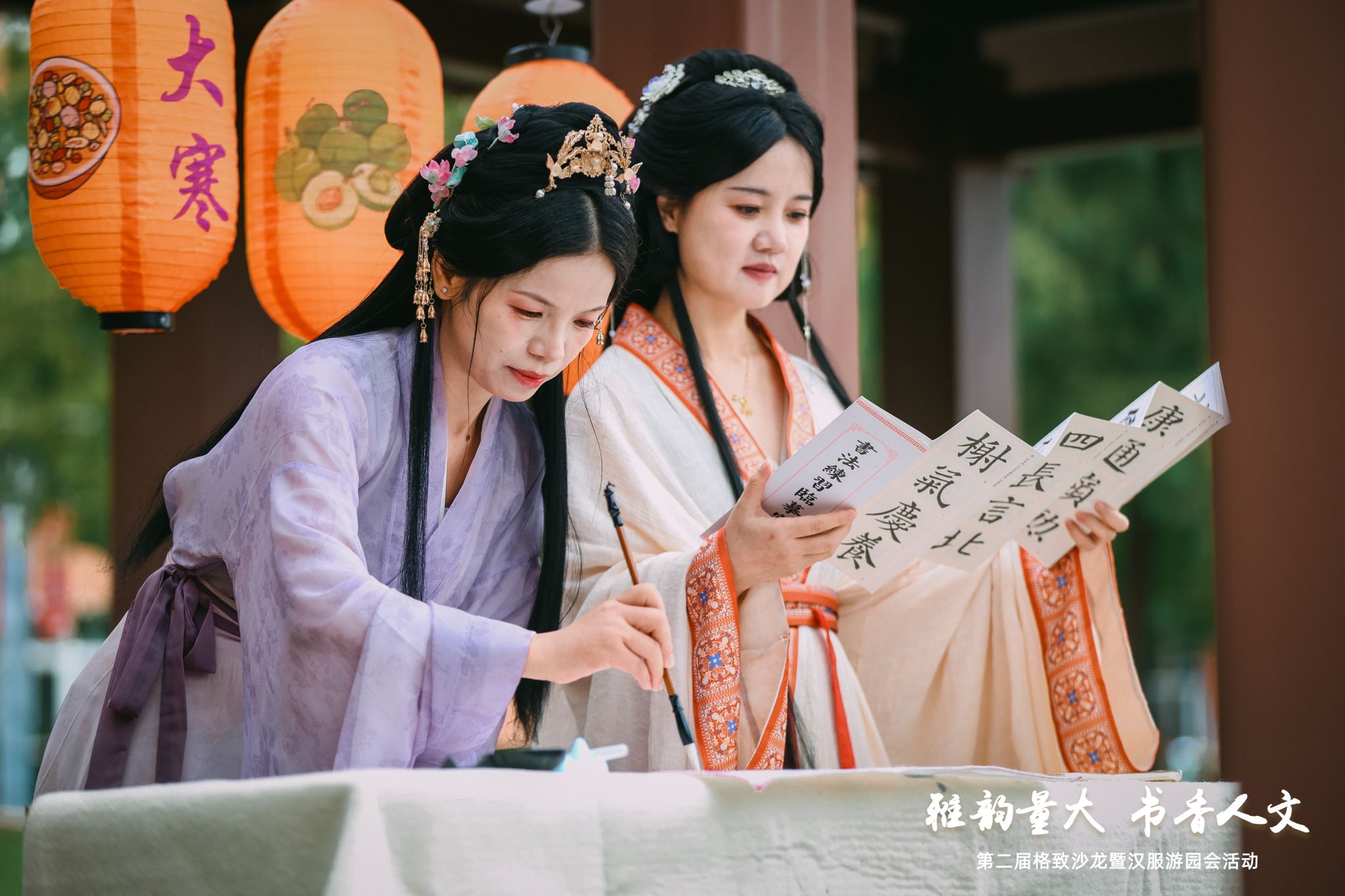 望舒亭下制备笔墨纸砚文房四宝,亭上彩灯高悬,上书廿四节气,日月芳华尽收眼底。书案边,碑帖在侧,书卷在握,展读幽情,书写胸襟。残荷未尽,碧波微澜,师生共着华夏之盛服,于谈笑间舞文弄墨,于宣纸方寸间挥洒胸襟。