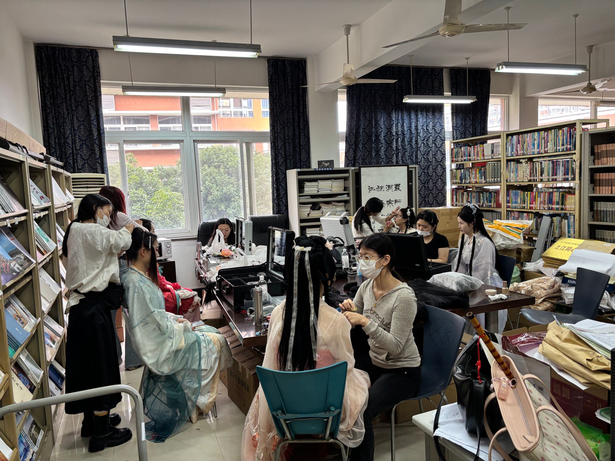 妆造前,修远汉服社的社员们向老师们讲解不同朝代、不同形制汉服的特点,从服装的穿戴方式到各个饰品的由来典故,从礼仪、身姿的注意事项到汉服天人合一、礼法自然以及中和之美的文化内涵。四位妆造师从上午9:30开始,根据唐风、宋制、明制等不同风格的特定要素,紧锣密鼓地为参与活动的33位教工完成眉妆、眼妆、唇妆、发型、配饰等一些列妆造流程。