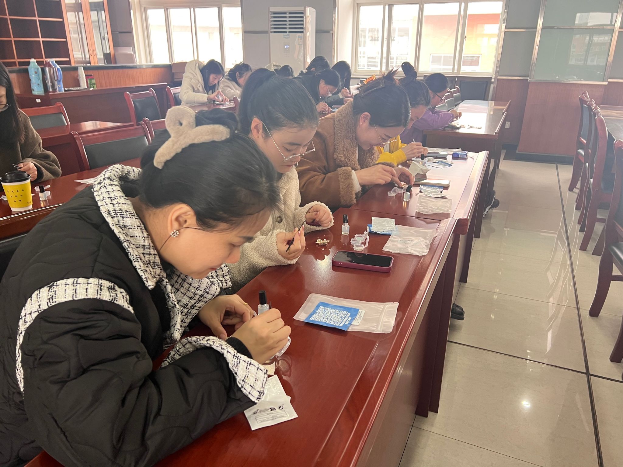 螺钿作为中国传统的装饰技艺,可追溯至商周时期,历经千年发展,以其精湛的工艺和华丽的视觉效果闻名于世。活动现场,老师们在了解制作过程后纷纷开始亲手制作。从挑选螺钿薄片、精心切割形状,到小心翼翼地粘贴在胸针托上,每一步都细致入微。女教工们全神贯注,手持工具,专注于手中的作品。她们脸上满是专注神情,相互交流探讨,现场气氛热烈而融洽。