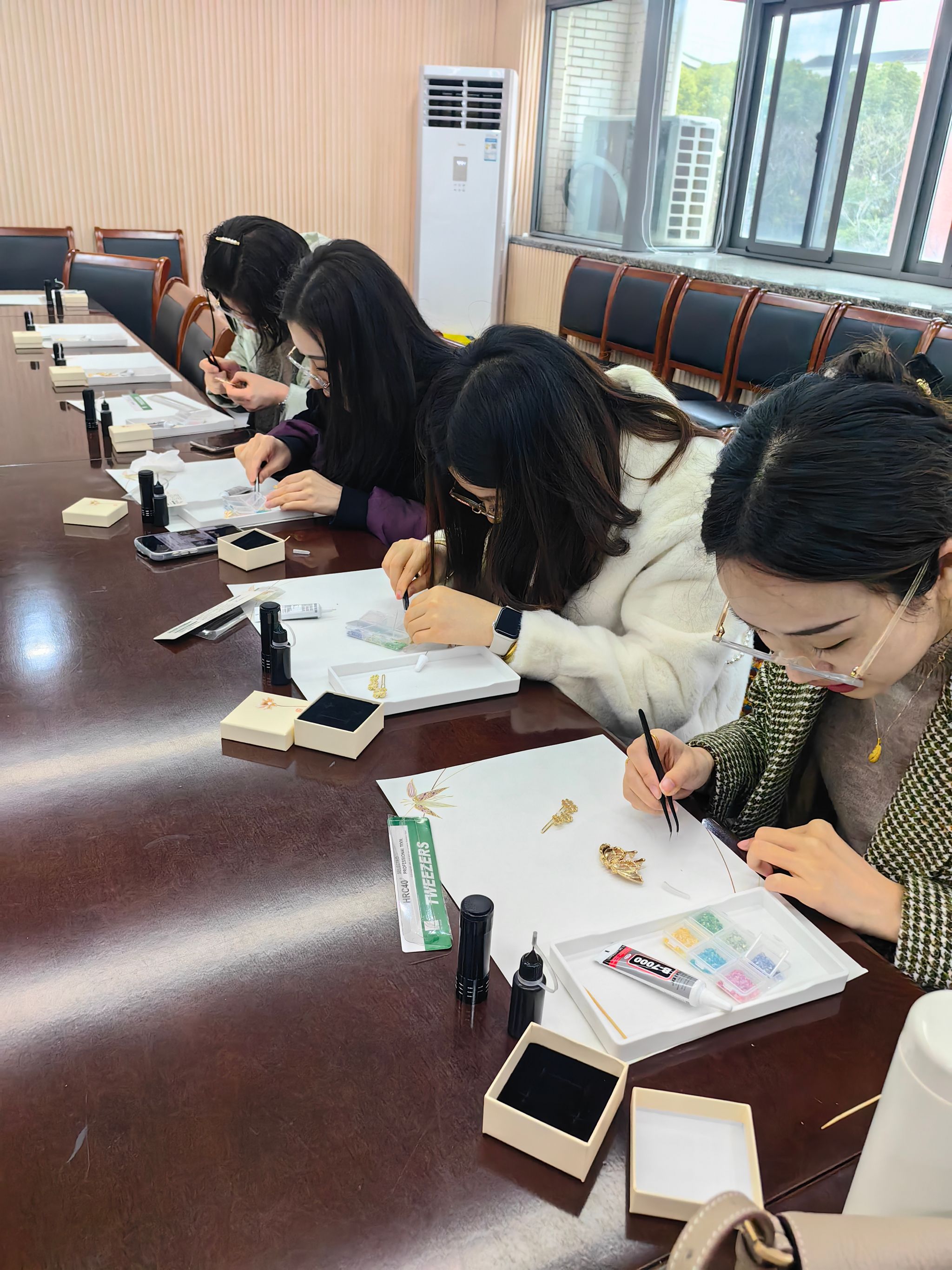 经过90分钟创作,20件独具匠心的胸针作品相继诞生:有的以螺钿勾勒水墨山水意境,有的用珍珠母贝拼出抽象几何图案。活动尾声,工会为每位参与者组织作品合影。现场教师纷纷表示,这种“知识输入+创意输出”的模式,既缓解了工作压力,又加深了对传统文化的认知。