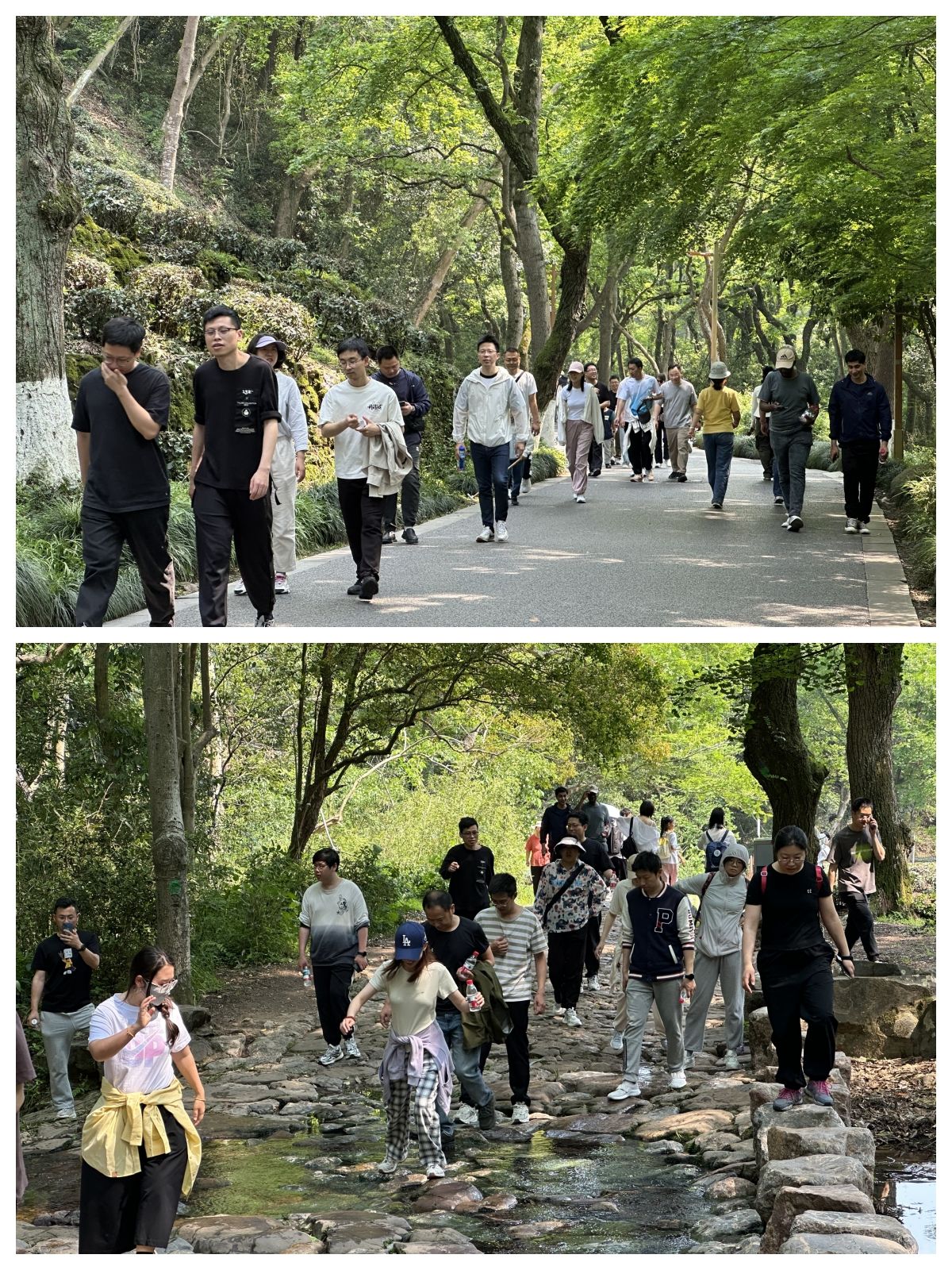 活动自九溪公交站启程,教职工队伍沿林荫步道蜿蜒前行,徜徉于天然山水画卷之中:但见溪涧潺潺流淌,两侧乔木枝叶葳蕤,漫山茶园如翡翠铺展,缕缕茶香随风沁人心脾。行进间,队伍先后观摩中国十大名茶之首龙井茶生产基地,探访全国文明村龙井村,在移步换景中领略自然与人文的完美交融。这场集徒步毅行、文化探访、生态游览于一体的特色活动,让参与者在欢声笑语中尽享春日胜景,在山水对话中涤荡身心尘埃。