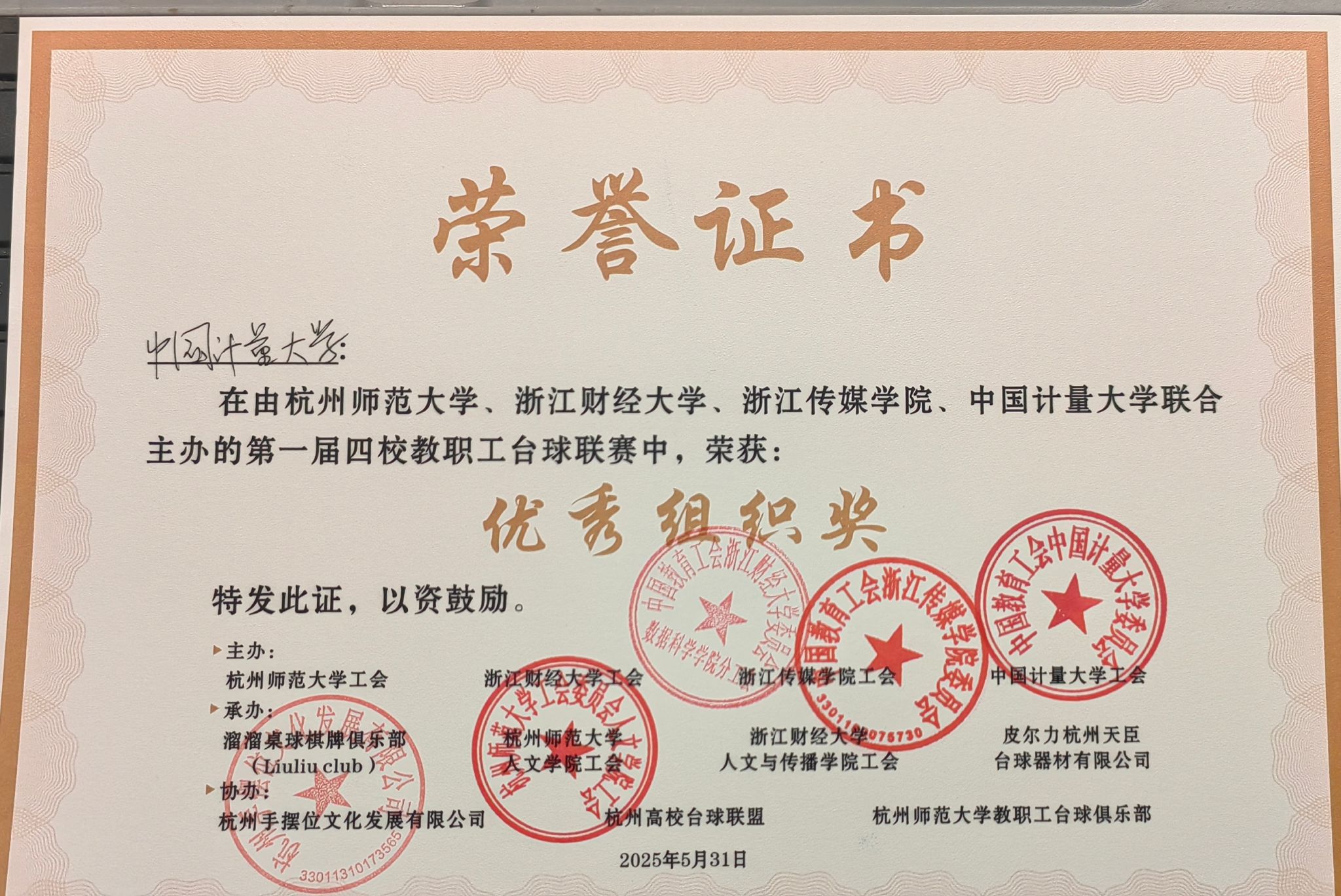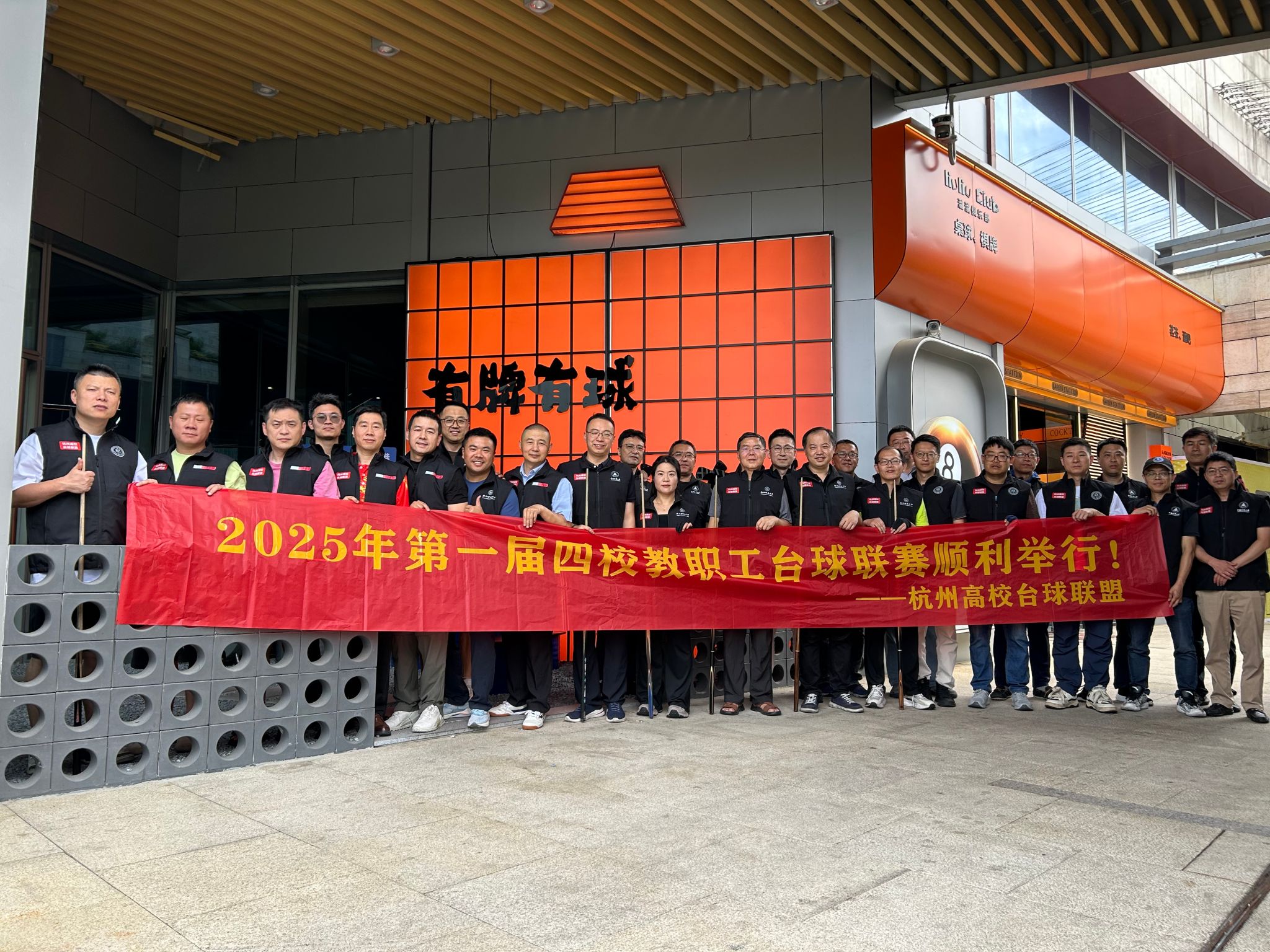 5月31日,由我校与杭州师范大学、浙江财经大学、浙江传媒学院联合主办的第一届四校教职工台球联赛在杭州拱墅区溜溜桌球俱乐部火热开赛。来自四所高校的32名教职工选手齐聚一堂,展开激烈角逐。我校选派了王一等7位教职工代表参赛。