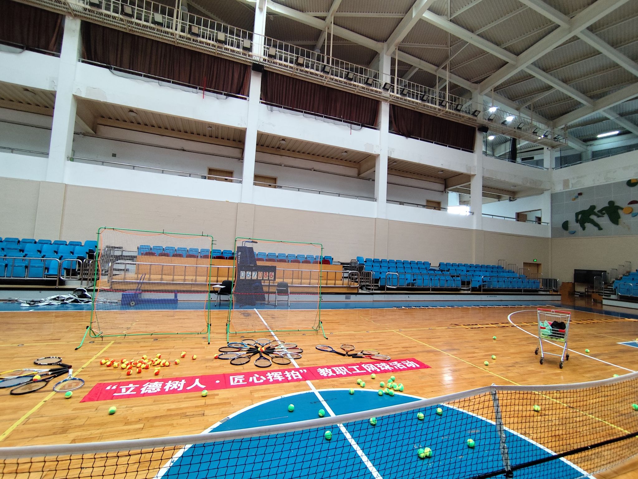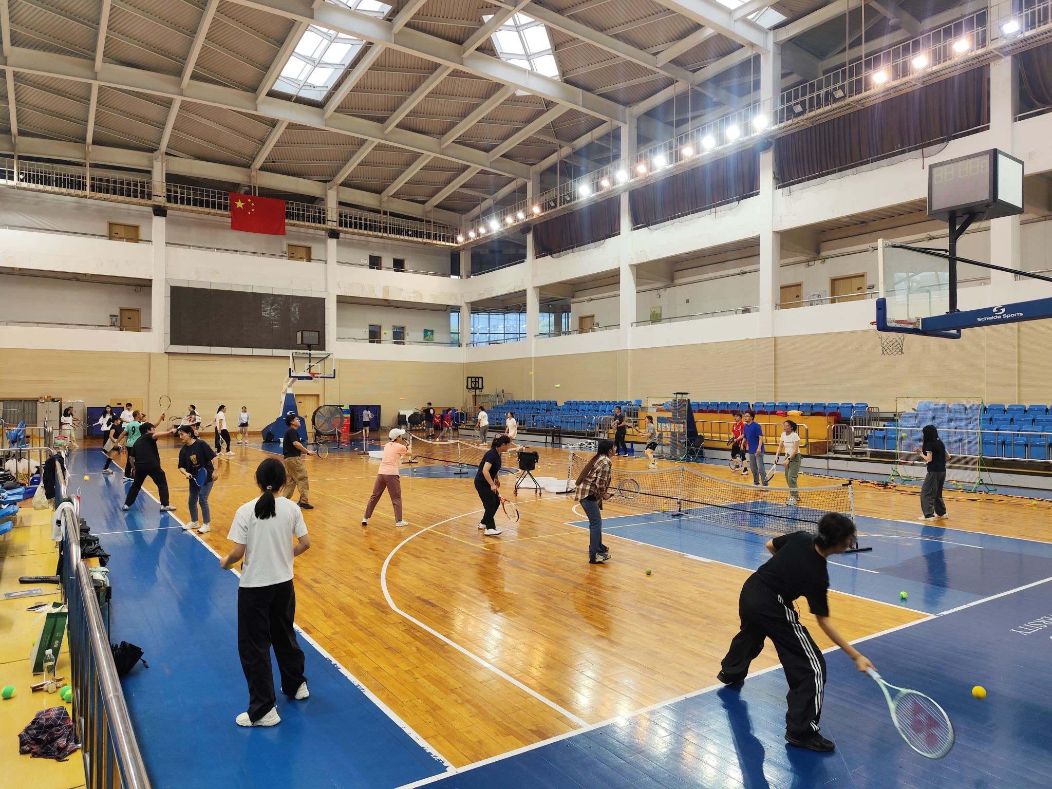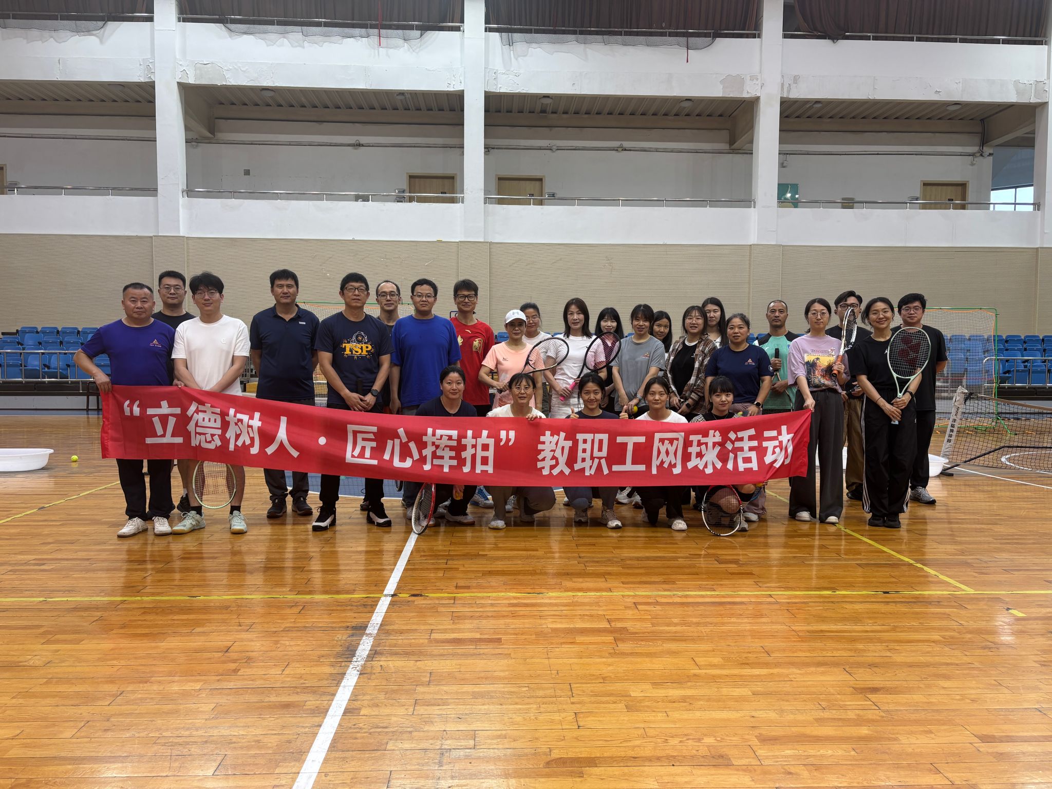 6月11日梅雨季的午后,原定室外举行的网球活动因雨移师天健体育馆篮球馆。工作人员创新性地从匹克球场调运三个球网横向架设,将篮球馆巧妙改造为临时网球场,为来自全校17个部门的近40名教职工带来了一场别开生面的网球体验。