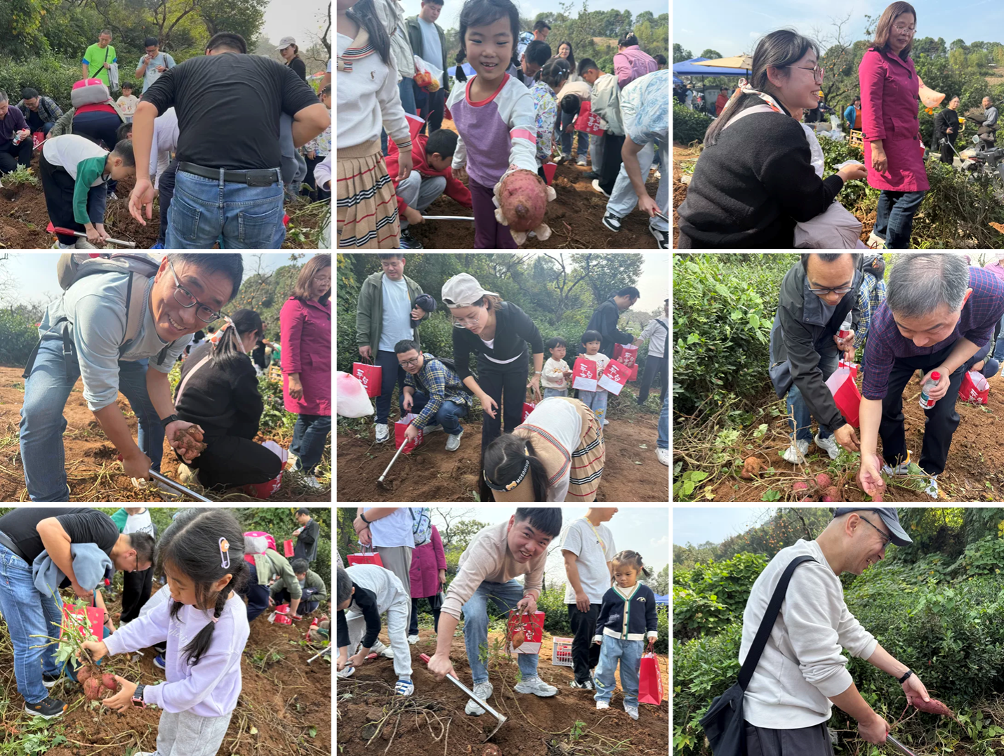 随后,老师们热情高涨地投入到秋收劳作中。大家走进挂满金黄果实的柿林,小心翼翼地采摘成熟的方柿,体味着丰收的喜悦;来到红薯地,大家手持农具刨土挖薯,在泥土的芬芳中,亲身感受农作物从播种到收获的艰辛。午餐时分,老师们在亲柚家餐厅品尝地道农家菜,简单的饭菜因参与劳动更显香甜,大家在烟火气中读懂了“一粥一饭当思来之不易”的深意。