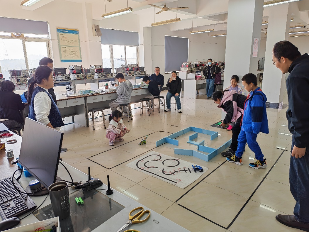 “这辆小车就像一个有生命的小探险家,”教师向孩子们解释,“它通过传感器‘触摸’迷宫墙壁,通过程序‘思考’前进方向。”紧随迷宫挑战之后的是黑线寻迹演示。另一辆专门设计的寻迹小车沿着地面上的黑色轨迹稳健行驶,在急转弯处灵活调整姿态,始终保持在轨迹中心,展现了程序的精准控制。