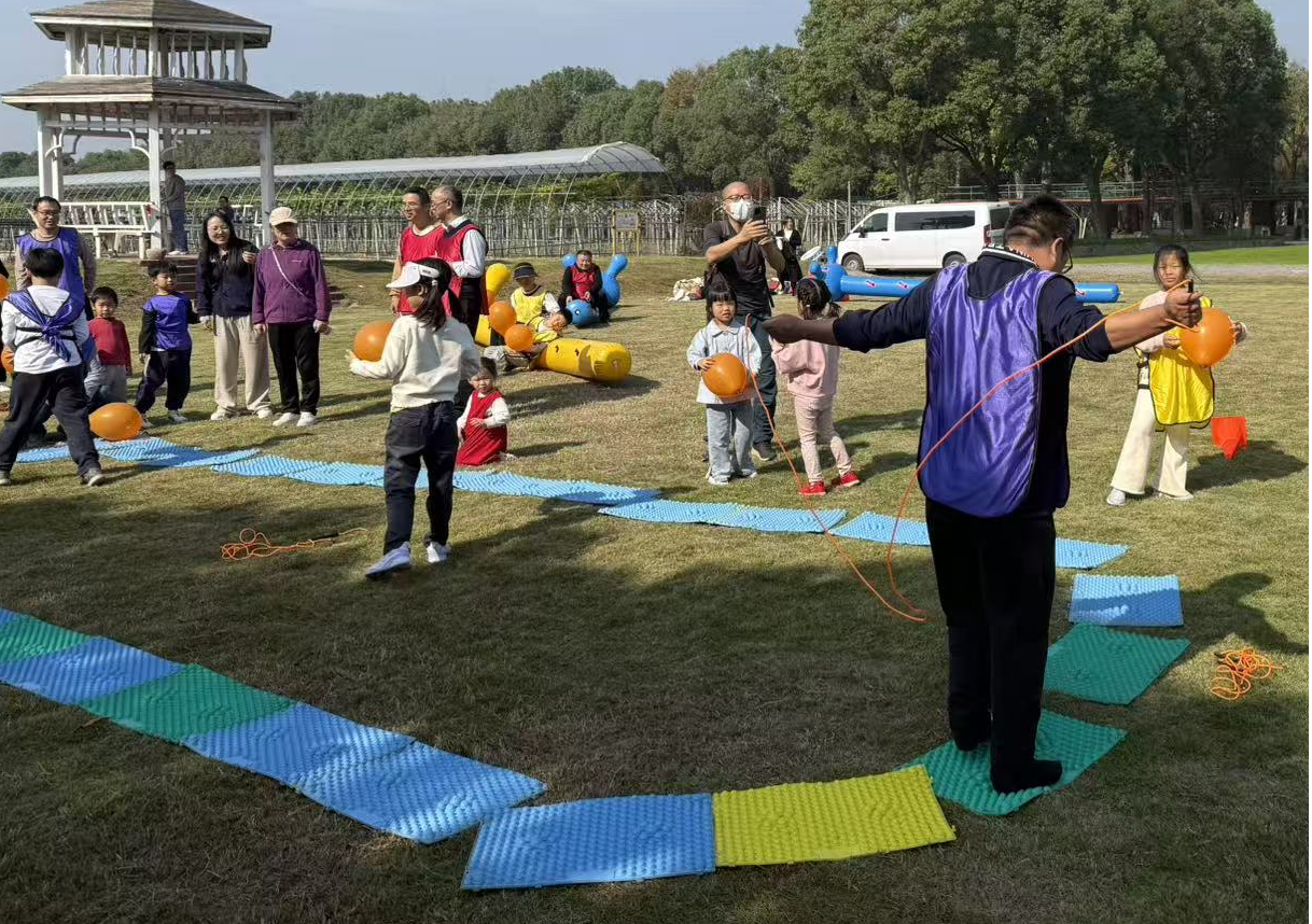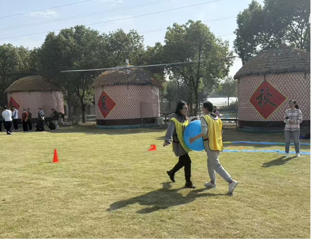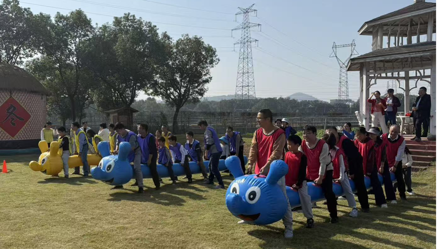 在主持人的策划下,参赛队员分成红黄蓝三只队伍。活动第一项是毛毛虫接力赛,参赛者们骑在充气毛毛虫道具上,双脚交替前行,像一条条欢快的毛毛虫在赛道上“蠕动”。队员们需紧密配合,保持节奏一致,稍有不慎就会“翻车”引发全场欢笑。最终,蓝队凭借默契的配合和稳定的发挥夺得冠军。第二项动力绳圈,全体队员围成圆圈,双手紧握绳索,通过统一节奏的上下摆动,完成团队目标。绳索在空中划出优美的弧线,象征着团队凝聚力的爆发。活动中,大家深刻体会到“心往一处想,劲往一处使”的力量。第三项背夹球接力,两人一组背靠背夹住气球,侧身移动完成接力。气球在奔跑中不时“调皮”掉落,引来阵阵惊呼和笑声。队员们或小心翼翼护球,或手忙脚乱补救,现场充满轻松愉快的氛围。第四项趣味铁人五项,融合了跳绳、袋鼠跳、滚轮胎、投篮和障碍跑五项任务,参赛者需连续完成挑战。有人“狼狈”地套着麻袋蹦跳,有人推着轮胎“横冲直撞”,还有人投篮时“百发不中”急得跺脚,观众席的加油声和笑声此起彼伏。第五项击鼓传花式接力赛,结合传统游戏与接力赛,鼓声停止时手持“花”的队员需完成趣味任务,现场气氛热烈,时而屏息凝神,时而爆发出哄堂大笑。