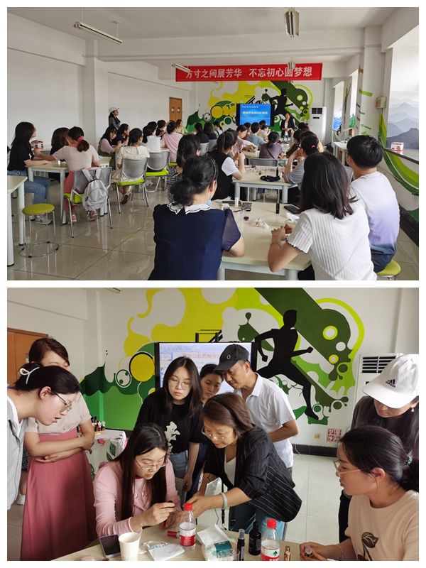 本次活动邀请了世中联植物精油疗法学校校长王英讲师现场指导。王老师有近30年的中药从业经验,对精油十分了解并具有丰富的应用经验,她给老师们讲解了植物精油疗法的知识,分享了精油应用于日常生活保健的技巧,并指导老师们用植物精油等天然材料进行口红制作。
