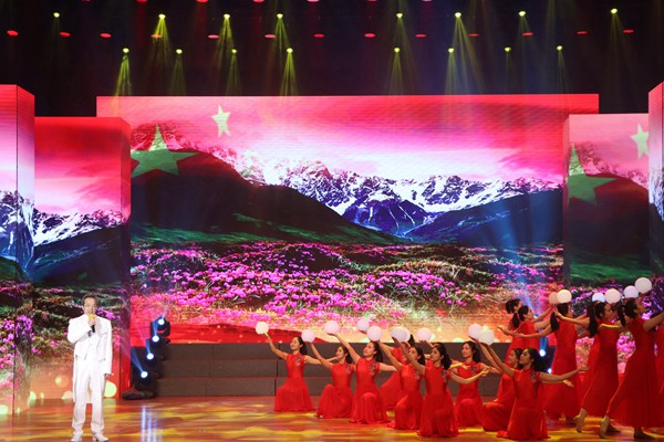 在校领导们的带领下,全场随着《没有共产党就没有新中国》的歌声打着节拍,气氛热烈,掌声满满,将晚会推向高潮。