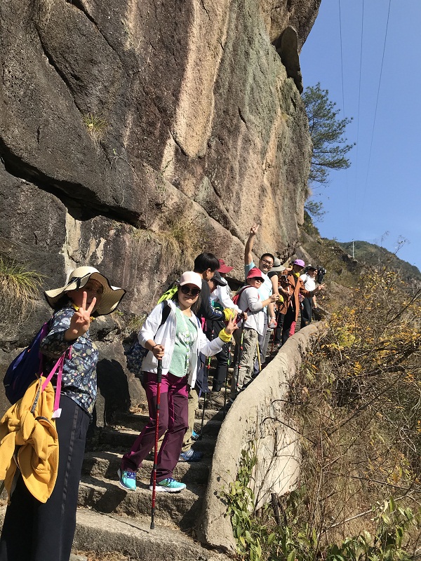 充分热身之后,教职工们沿着弯曲山路向本次活动终点进发。途中大家相互搀扶,相互鼓劲,用汗水见证古人的坚毅无畏,用脚步丈量历史文化精髓。沿途可见峡谷山中的溪水、瀑布,伴着大山里的炊烟和落日的余晖,全体人员在既定时间内顺利完成了对徽杭古道的正面直穿。