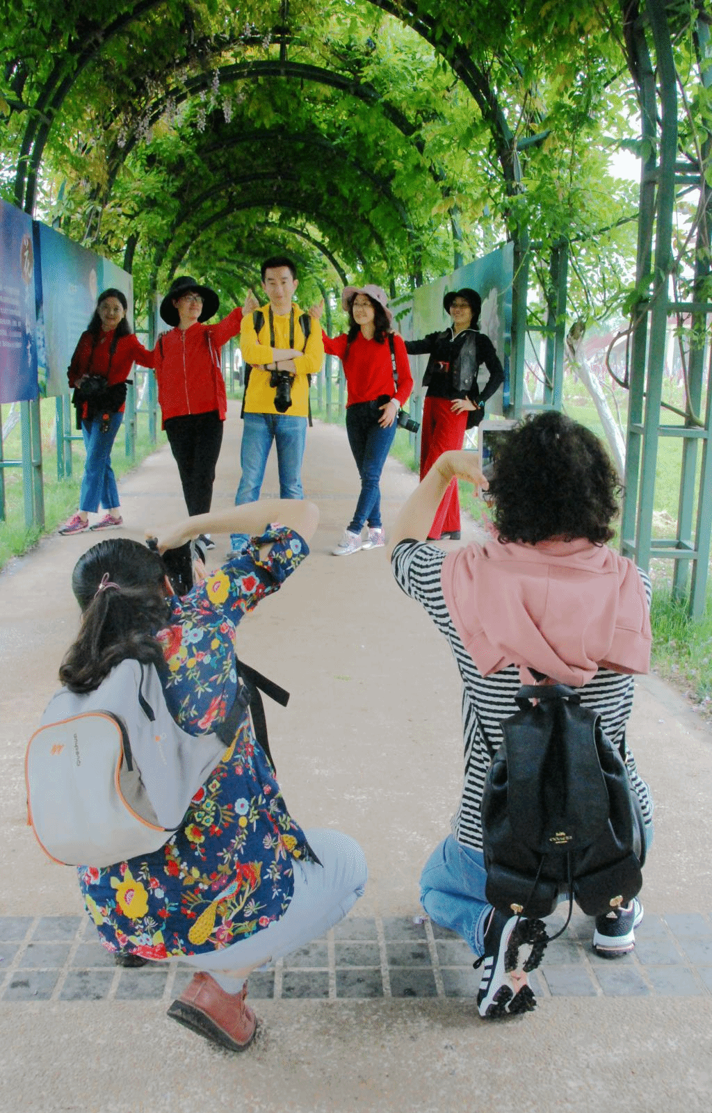 新一届教职工摄影协会共吸纳新会员60余名,由离退办主任范风华任会长,宣传部戴洁任秘书长。活动当天,摄友们自主组队、自由拍摄,上至年近耄耋的老摄友,下至刚入而立的新拍手,不论入行年资,相互学习、互帮互助、共同交流。他们时而贴进花丛,定格彩华吐露;时而登高架机,一览花海全景;时而凝神屏息,守候花间采蜜;时而,立马回头,抓拍喜悦瞬间。会员们不仅将十余种花拍出各色姿态,还利用各种地形,设计单人姿态和群组造型,让人花合一。多角度取景,互为模特,兼顾了景物、人像、微距等多种摄影形式。资深摄友韩玲莉老师更是自带航拍器,经过坚持不懈的耐心调试,终于在紫樱花海中给会员与新会旗来了一张“上帝视角”合影,大家都啧啧赞叹。