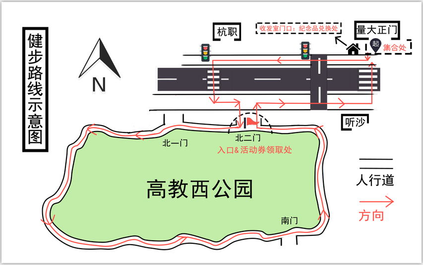 从学校正大门口出发,沿学源街至杭职门口,过马路后至高教西公园,由公园北门进入沿公园外圈道路由西向东(逆时针)行走一圈后至指定地点领取活动券,返回公园北门沿学源街至学校正大门。
